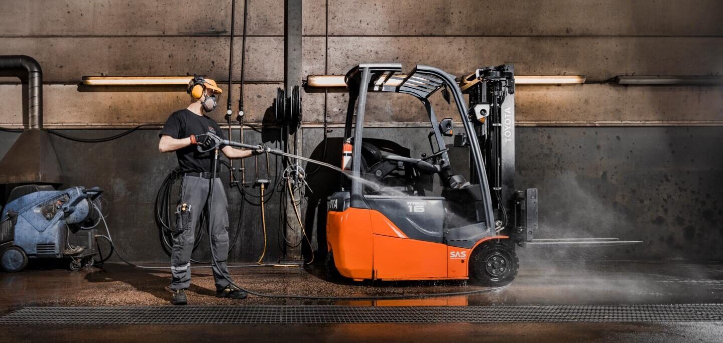 המלגזה נשטפת בקפידה, תוך שמירה מלאה על המערכות האלקטרוניות.